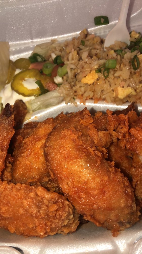 Part. Cooked wing of a chicken serve with 2 item (Shrimp Fried Rice or French Fries and Salad)